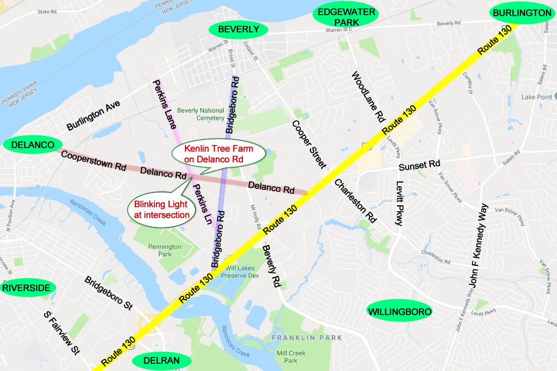 Kenlin Tree Farm is in Edgewater Park, NJ. Entrance is on Delanco Road, by a white Kenlin Tree Farm sign, near the intersection of Perkins Lane and Delanco Road.